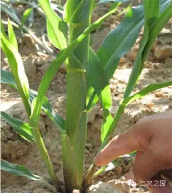 5、由于玉米植株的頂端生(shēng)長點受到不同程度的抑制,植株矮化(huà)而産生(shēng)分(fēn)蘖。比如(rú):植株感染粗縮病、苗後除草劑産生(shēng)藥害、控制植株莖稈高度的矮化(huà)劑形成的藥害等都可能(néng)生(shēng)成玉米分(fēn)蘖(丫子(zǐ))。